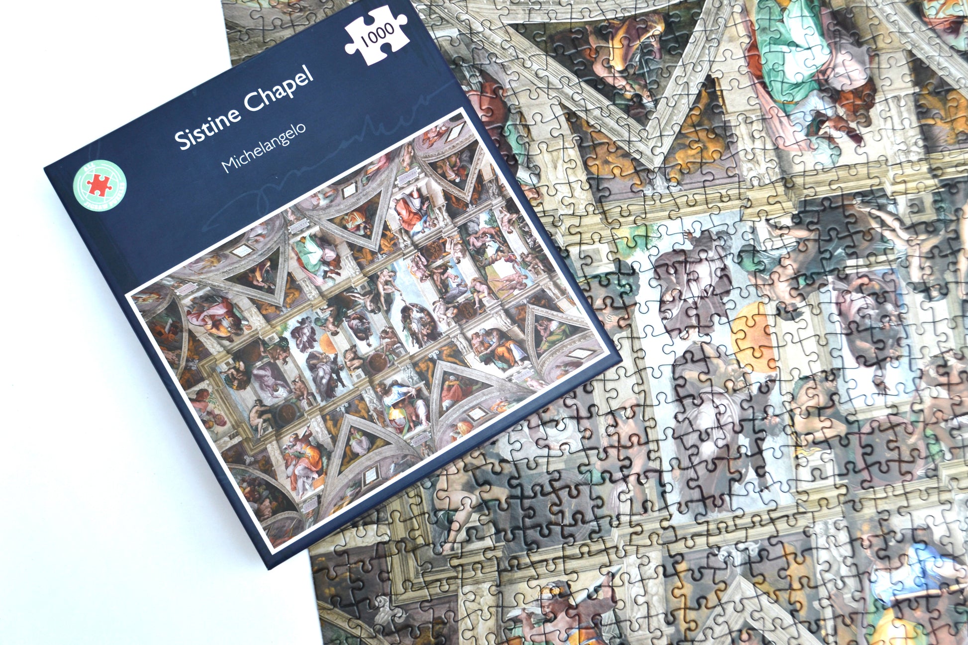 This 1000 or 500 piece jigsaw puzzle shows Michelangelo's Sistine Chapel ceiling.