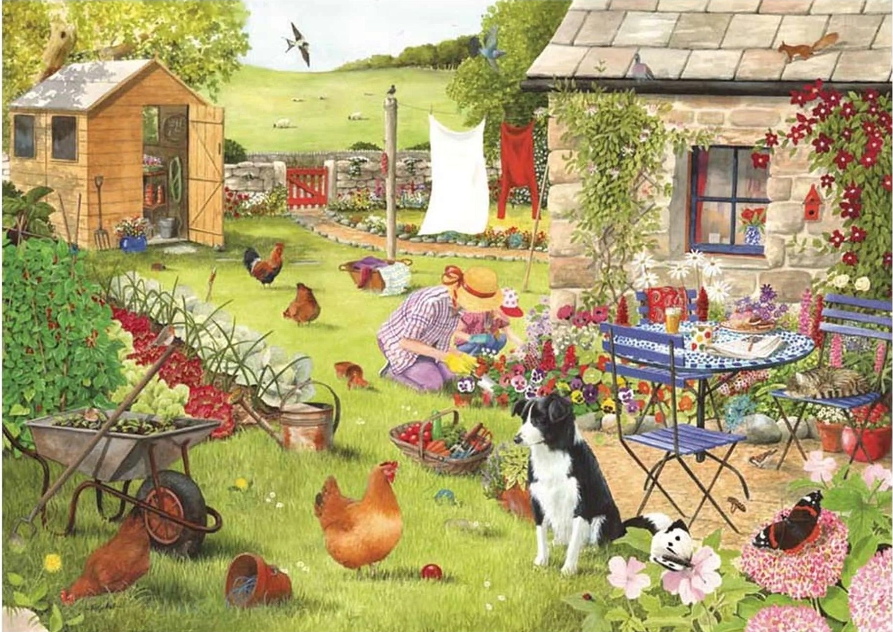 Chickens roam freely around the garden, a Border Collie basks in the sunshine, and a table nearby is set with cakes and coffee, ready for a relaxing pause. Every corner of the scene is filled with life and detail, making it a joy to spot something new as you piece the puzzle together.